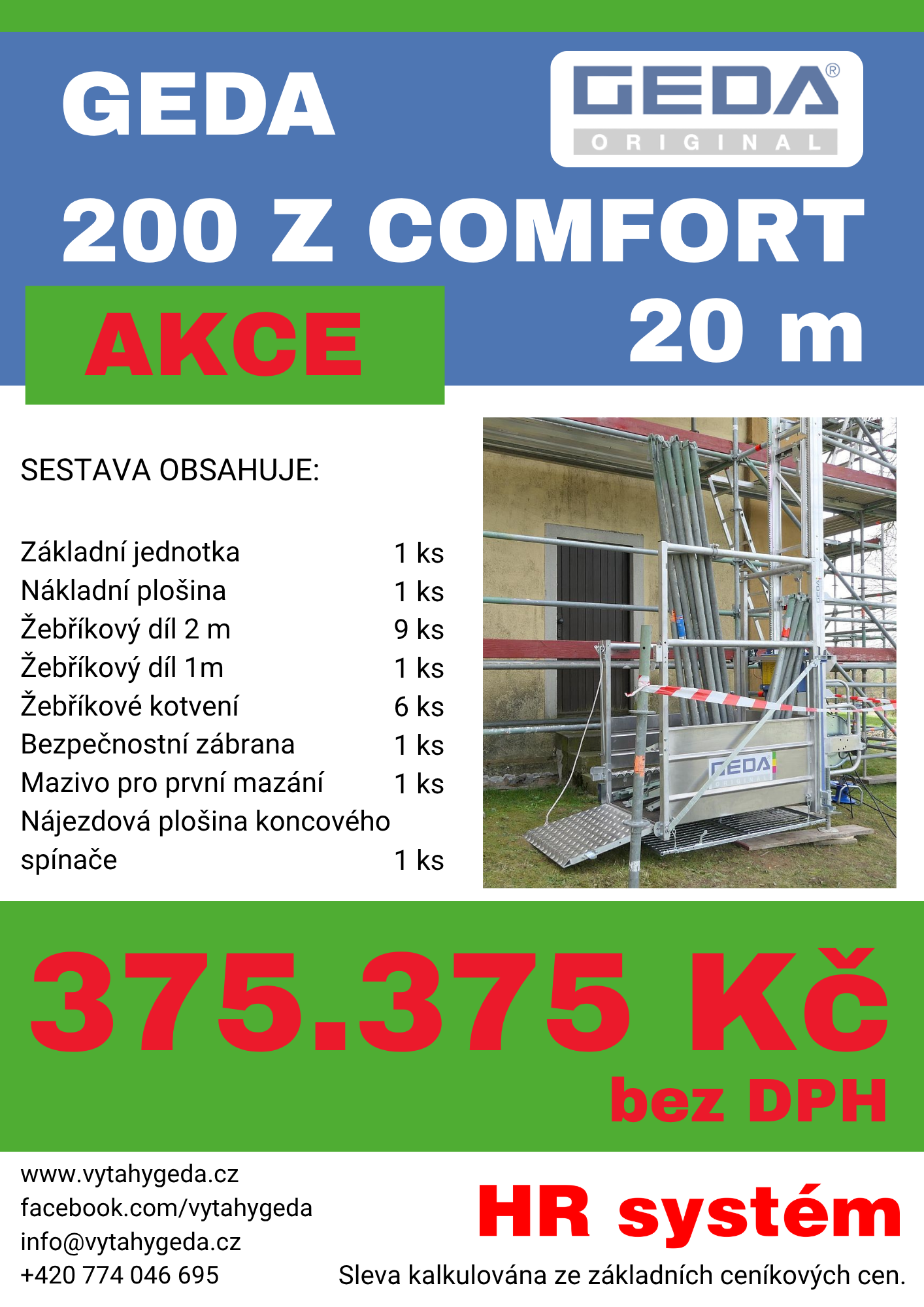 Jsme autorizovaným dodavatelem německé značky GEDA, která se zaměřuje na prodej stavebního vybavení. Stroje a příslušenství jsou vyráběny v Německu ve společnosti GEDA-Dechentreiter GmbH & Co. KG již více než 90 let a jsou známy svojí vysokou kvalitou, velkou odolností a širokou oblastí použití. Mezi nabízené výrobky patří zejména sloupové a šikmé stavební výtahy, lešenářské vrátky a shozy stavební sutě.